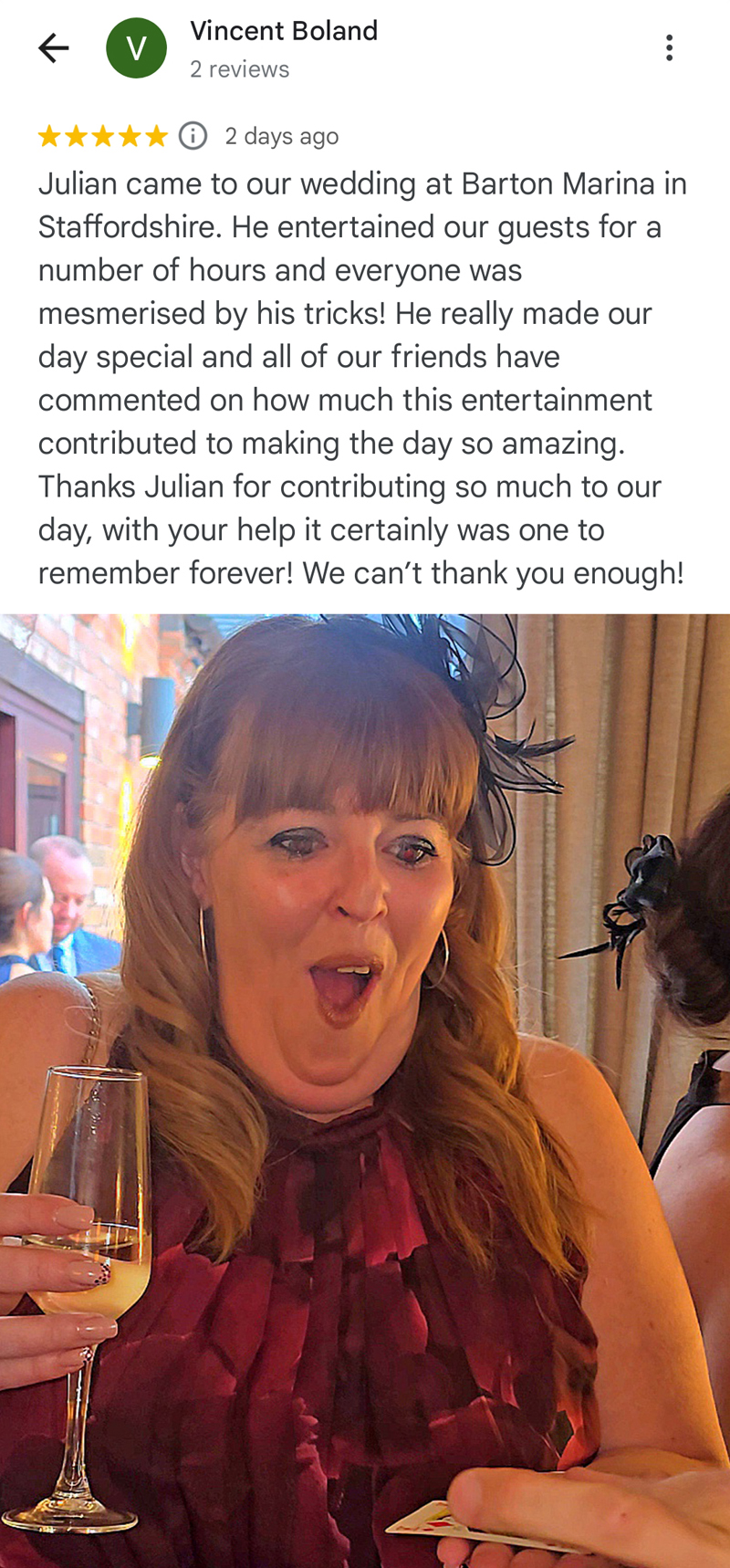 your wedding breakfast, Julian will visit the tables and perform a unique